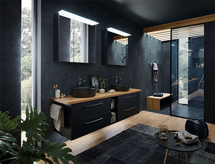 Ob klassischer Marmor, edle Goldakzente oder natürliches Holz - Badezimmer, in denen Schwarz eine tragende Rolle spielt, geben unendlichen Spielraum für individuelle Gestaltungskombinationen. Setzen Sie schwarze Elemente - wie Badezimmerarmaturen und Badmöbel - als Farbakzente ein, sorgen Sie für einen optischen Frische-Kick. Niemals aus der Mode kommen Badezimmer in der Farbkombination Schwarz und Weiß. Das Spiel mit schwarzen und weißen Formen und Mustern verleiht Wänden und Böden nach Ihrem Willen eine ruhige oder anregende Ausstrahlung. In der Verbindung mit natürlichem Holz bilden dunkle Oberflächen im Bad eine gelungene Einheit, an der Sie sich über lange Zeit nicht sattsehen können.