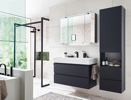 Badmöbel in Schwarz gibt es in vielfältiger Ausführung in matter Optik und in Hochglanzoptik. Sie fügen sich harmonisch in Ihr modern und klassisch ausgestattetes Bad ein. Von offen und schlicht auf schwarzen Metallbeinen bis zum vollständig mit Auszügen und Türen ausgestattetem Waschtisch können Sie Möbel für das Bad in den unterschiedlichsten Designs wählen. In Kombination mit schwarzen Elementen punktet vor allem Holz. Das Zusammenspiel dieser beiden Materialien ist sehr beliebt und bringt durch die warme Ausstrahlung ein Stück Natur in Ihr Zuhause. Schwarzes Glas für Fächer und Ablagen sowie robuste Keramikoberflächen sind zudem extrem pflegeleicht und sehen schick aus.