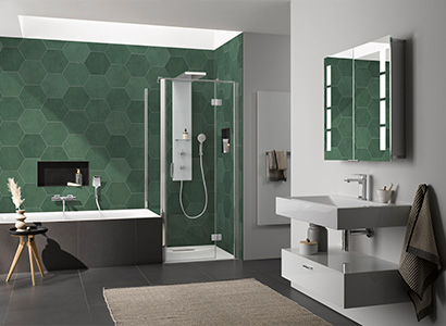 Passend zum Thema „schwarzes Bad“ sind Profile und Scharniere von Duschkabinen und Duschwänden ebenfalls in der Trendfarbe erhältlich.