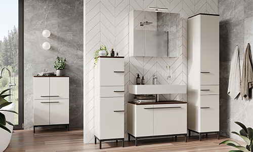 Ein stehendes Badmöbel-Set kann entweder mit oder ohne Beine bzw. Füße gearbeitet sein. Je höher die Füße sind, desto mehr Platz steht zur Reinigung der darunter befindlichen Fläche zur Verfügung. Darüber hinaus können Sie diese Freifläche für flexible Lösungen nutzen. Verstauen Sie hier zum Beispiel einen kleinen Tritthocker oder ein Körbchen mit frischen Handtüchern. Bei einem Waschtischunterschrank mit Füßen ist außerdem ein komfortables Stehen am Waschbecken möglich. Bei einem Waschtischunterschrank, der ohne Füße direkt auf dem Fußboden steht, ist zwar keine unmittelbare Reinigung der Fläche realisierbar, er schützt diese jedoch vor Verschmutzungen. Weiterhin bietet ein solches Badmöbel zusätzlichen Stauraum, wenn kein Platz für Badschränke, wie Mittelschrank oder Highboard, im Badezimmer zur Verfügung steht.